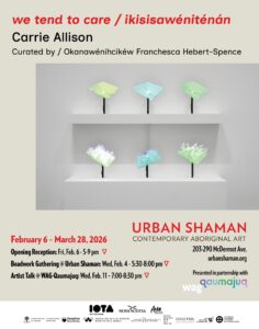 IOTA Studios is honoured to be a presenting partner for we tend to care, a solo exhibition by Carrie Allison. This iteration in Winnipeg is curated by Franchesca Hebert-Spence and Marie-Anne Redhead, and is on view simultaneously in Urban Shaman & WAG-Qaumajuq in Winnipeg, MB. Beadwork Gathering: Wed, Feb. 4th – 5:30-8:00 pm at Urban